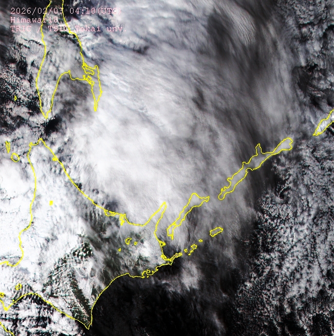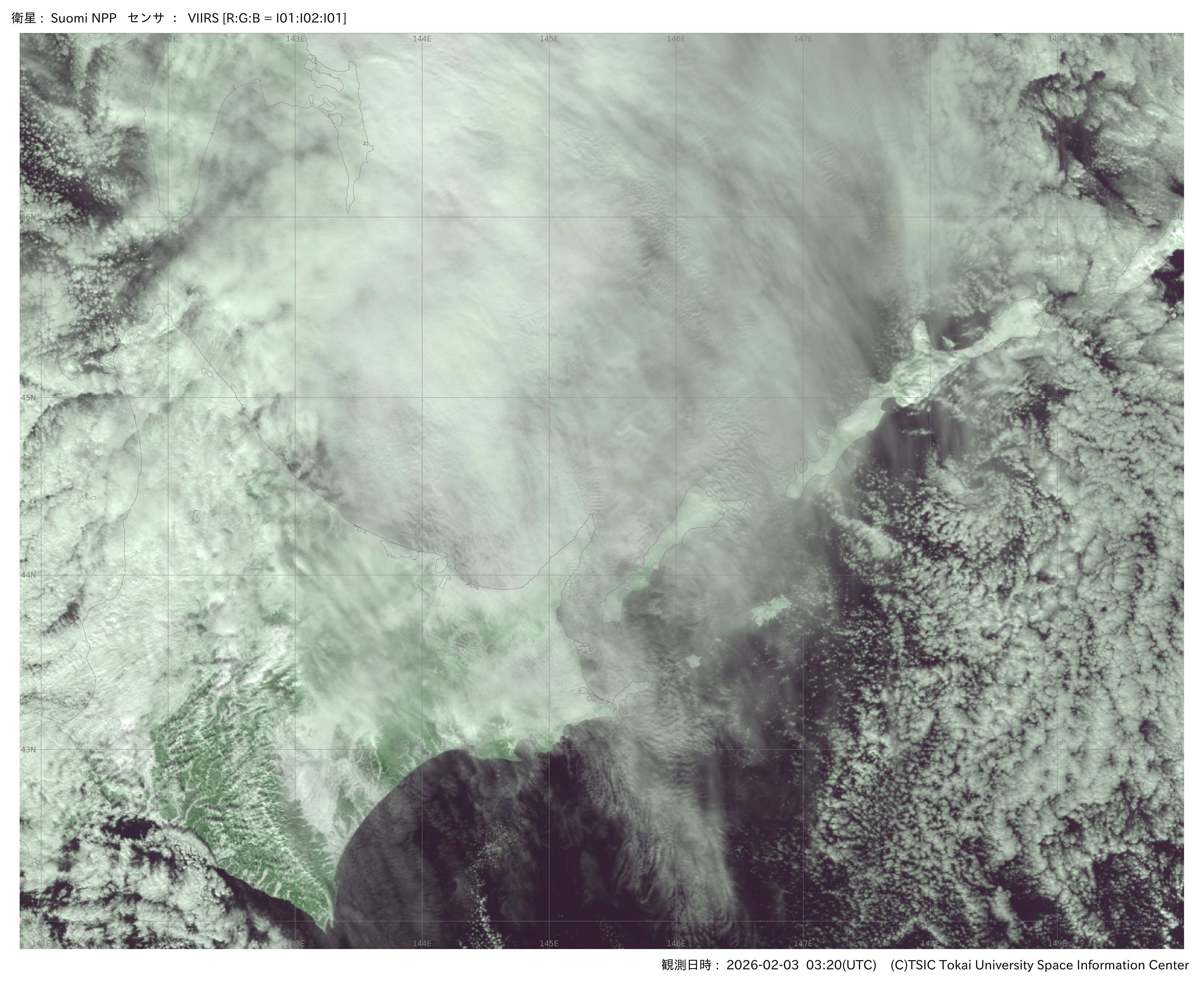 NASAの地球観測衛星NPP/JPSS1のVIIRSセンサが観測したオホーツク海周辺の最新の画像です